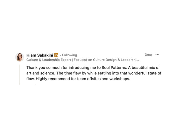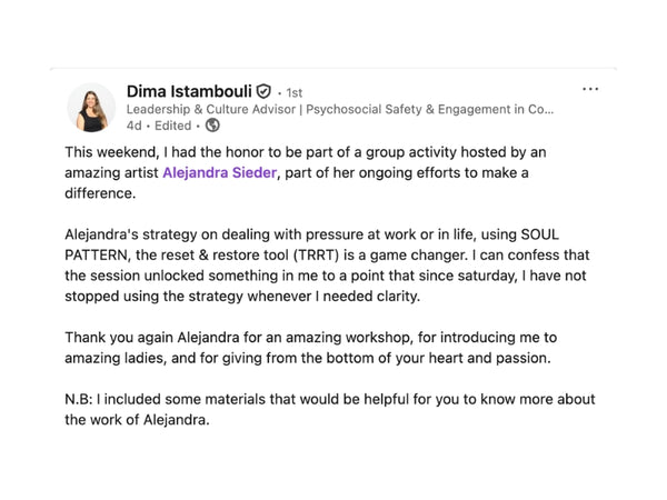 SOUL PATTERN: The Reset Restore Tool is a clarity, stress regulation and performance workshop that teaches employees a simple, practical method to calm the mind, regulate stress and restore clarity in minutes. It is grounded, science-informed and designed for real workplace pressure.